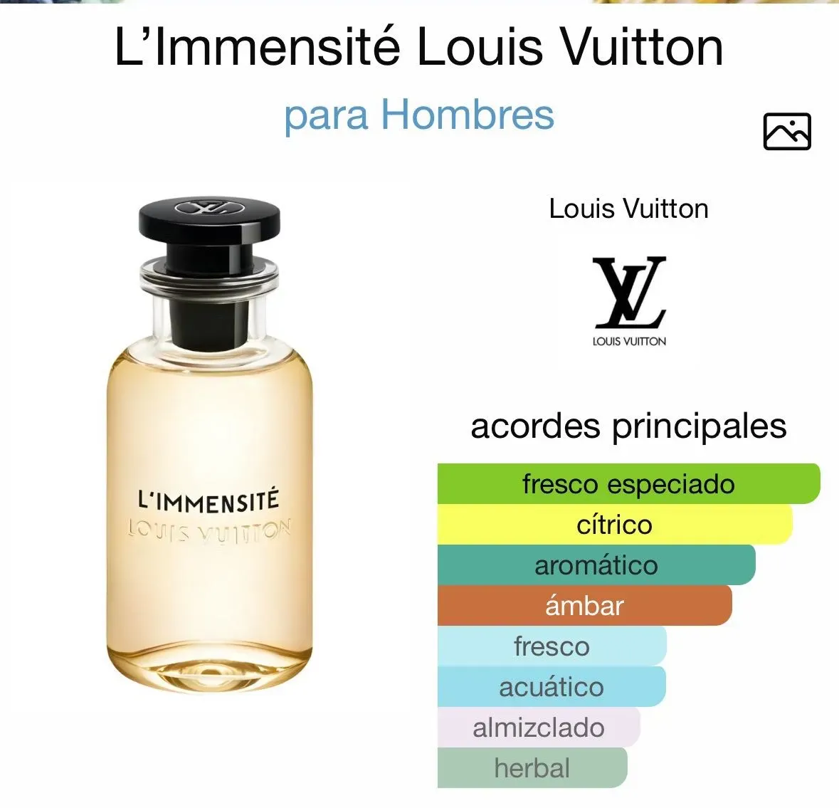 L’Immensité de Louis Vuitton es una fragancia de la familia olfativa Oriental Especiada para Hombres. L’Immensité se lanzó en 2018. La Nariz detrás de esta fragrancia es Jacques Cavallier Belletrud. Las Notas de Salida son toronja (pomelo), jengibre y bergamota; las Notas de Corazón son notas acuáti...